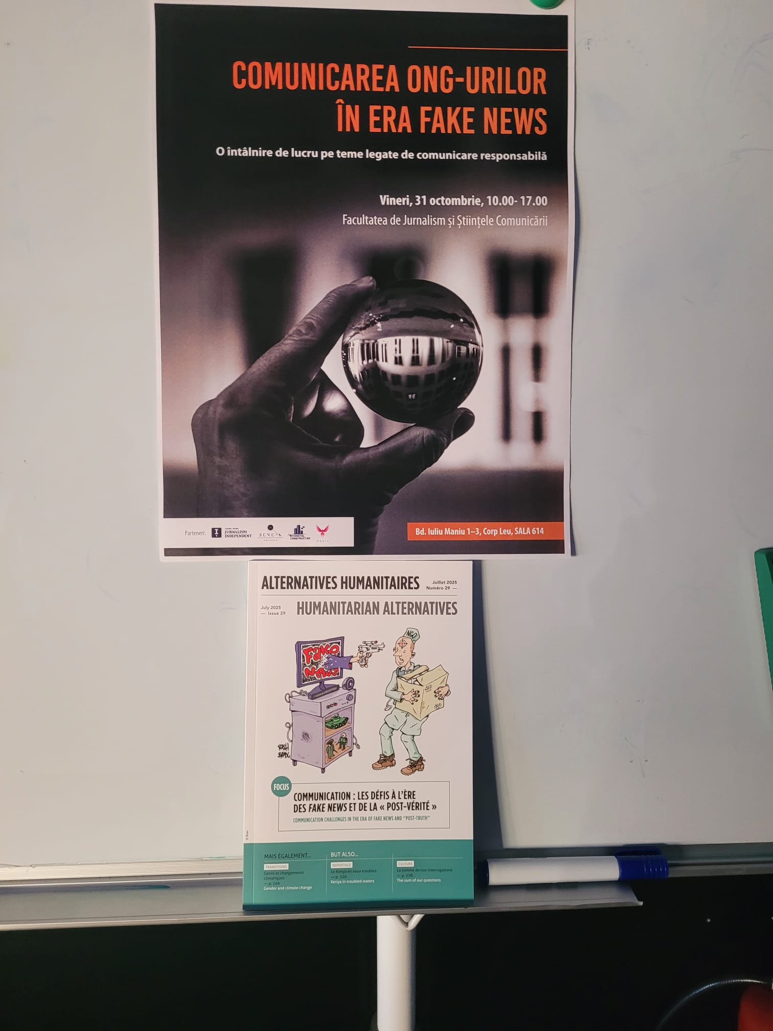 Vineri, 31 octombrie 2025, Facultatea de Jurnalism și Științele Comunicării (FJSC) și Școala Doctorală în Științele Comunicării (ȘDȘC) au organizat, alături de Facultatea de Științe Politice, CEREFREA, Université Lumière Lyon 2 – ICOM, Societatea Presei și a Jurnaliștilor Francofoni, Communication Sans Frontières și revista Alternatives Humanitaires, o dezbatere dedicată comunicării ONG-urilor în era dezinformării.